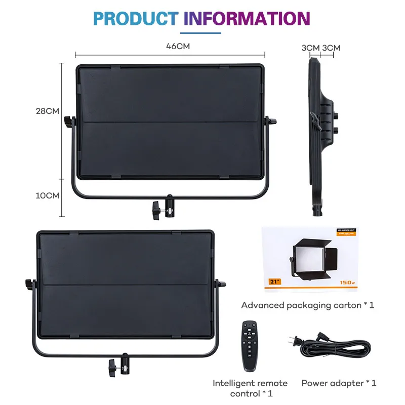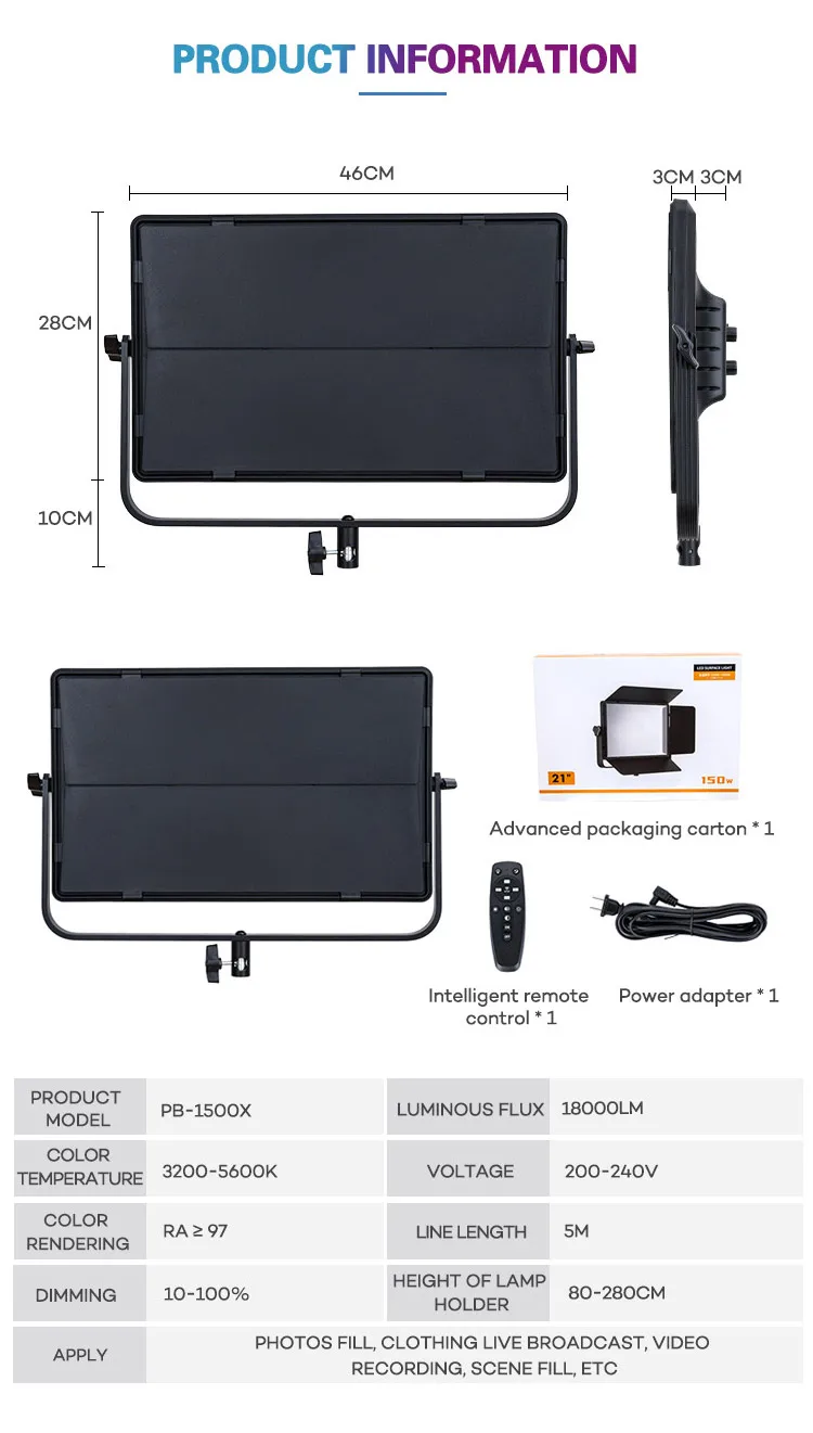 PB-1500X 120W LED-Panel-Videobeleuchtung für Kameraaufnahmen. Stabiles Lichtausgangsleistung, helle Beleuchtung der Aufnahmeumgebung. Der hohe Farbwiedergabeindex ist treuer bei der Wiederherstellung lebhafter Bilder. Helligkeitsanpassung möglich, um je nach unterschiedlichen Bedürfnissen eine passende Atmosphäre zu schaffen. Nicht umfangreich und einfach zu installieren, für das Studio-Aufnahmen im Innenbereich kann ein Stativ zur Unterstützung der Aufnahme verwendet werden, während die Videokreation bei Outdoor-Aufnahmen einen exzellenten Beleuchtungsrahmen bietet.