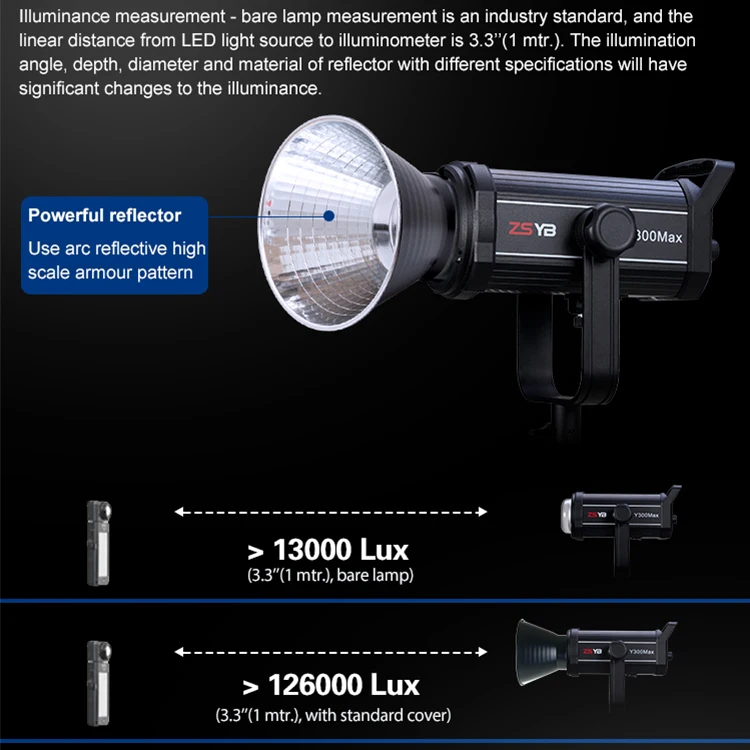 Klicken Sie Hier Für Mehr Rabatte!!! ProduktdetailsModellY300MAXEingangsspannungAC 200V-220VAusgangsleistung300WFarbwiedergabeindex97Korrelierte Farbtemperatur2700K-6500KLED Anzahl1PCSLichtstärke30000lm1 Meter Beleuchtungsstärke126000lux(Mit Refektor)/130...